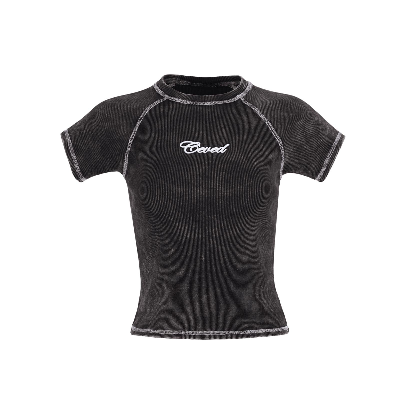 Camiseta dama negra con lavado Acid Wash que combina estilo urbano y comodidad. Diseño cropped que realza la silueta, confeccionada en tela rib licrada para un ajuste perfecto y flexible. Destaca el bordado personalizado "Ceved" en alto relieve que le da un toque exclusivo. Mangas fusionadas con cuello y costuras en contraste blanco para un acabado moderno. Marquilla en satín suave al tacto que garantiza calidad en cada detalle.