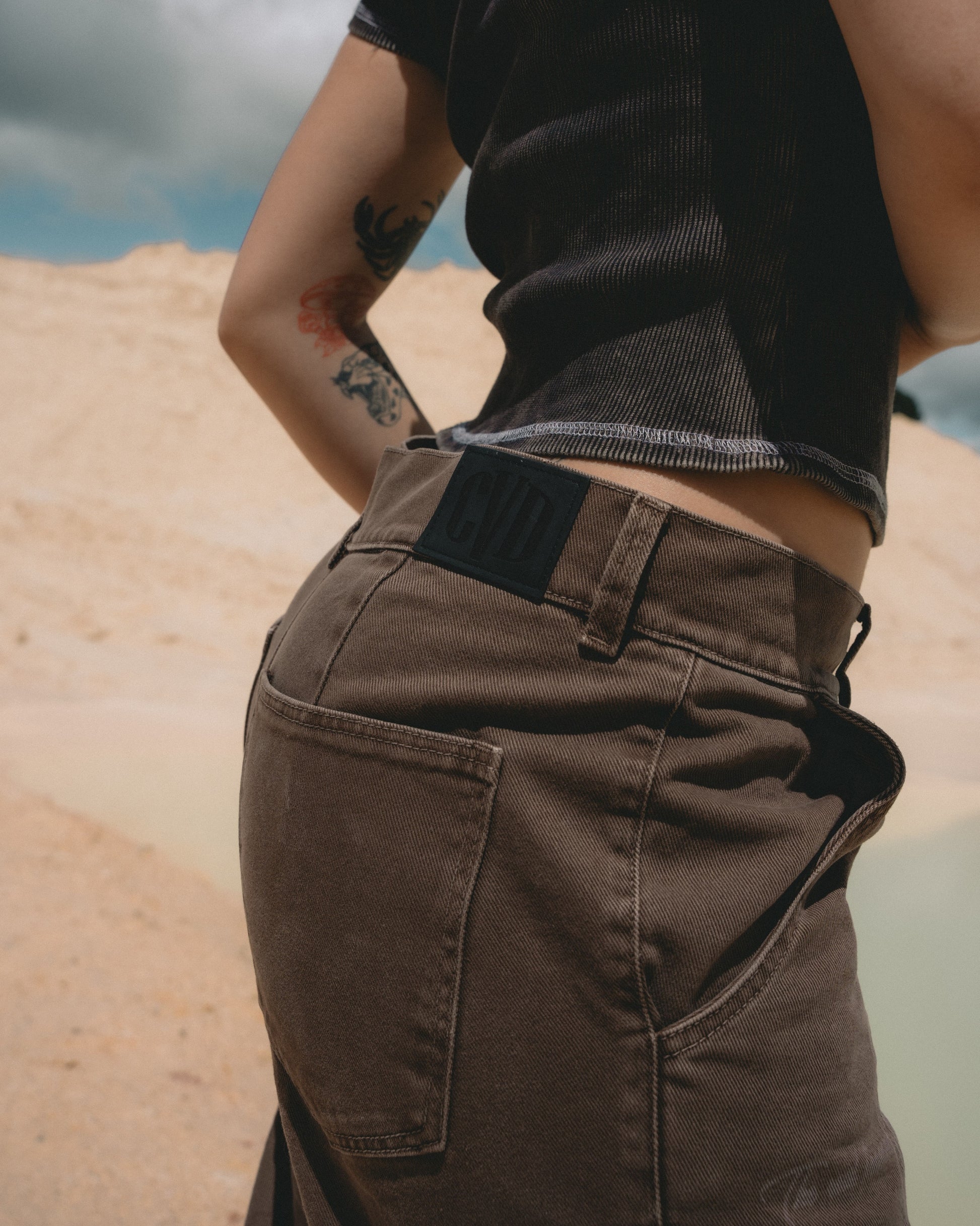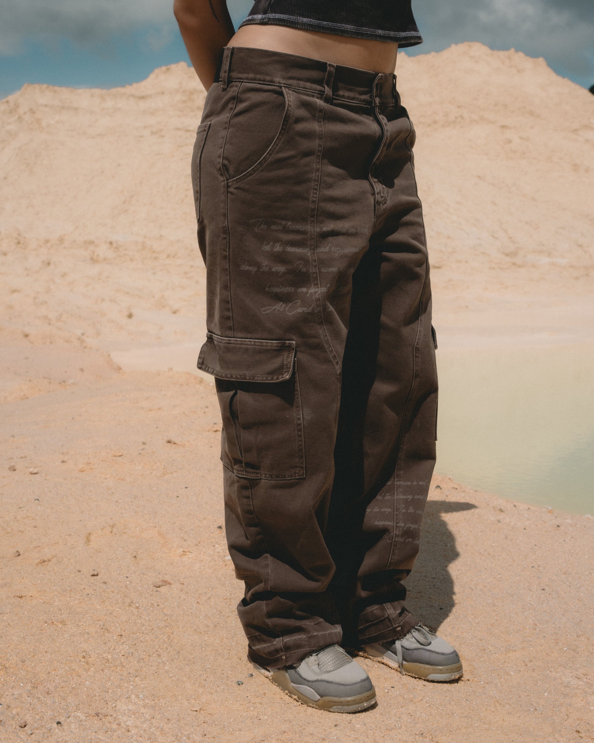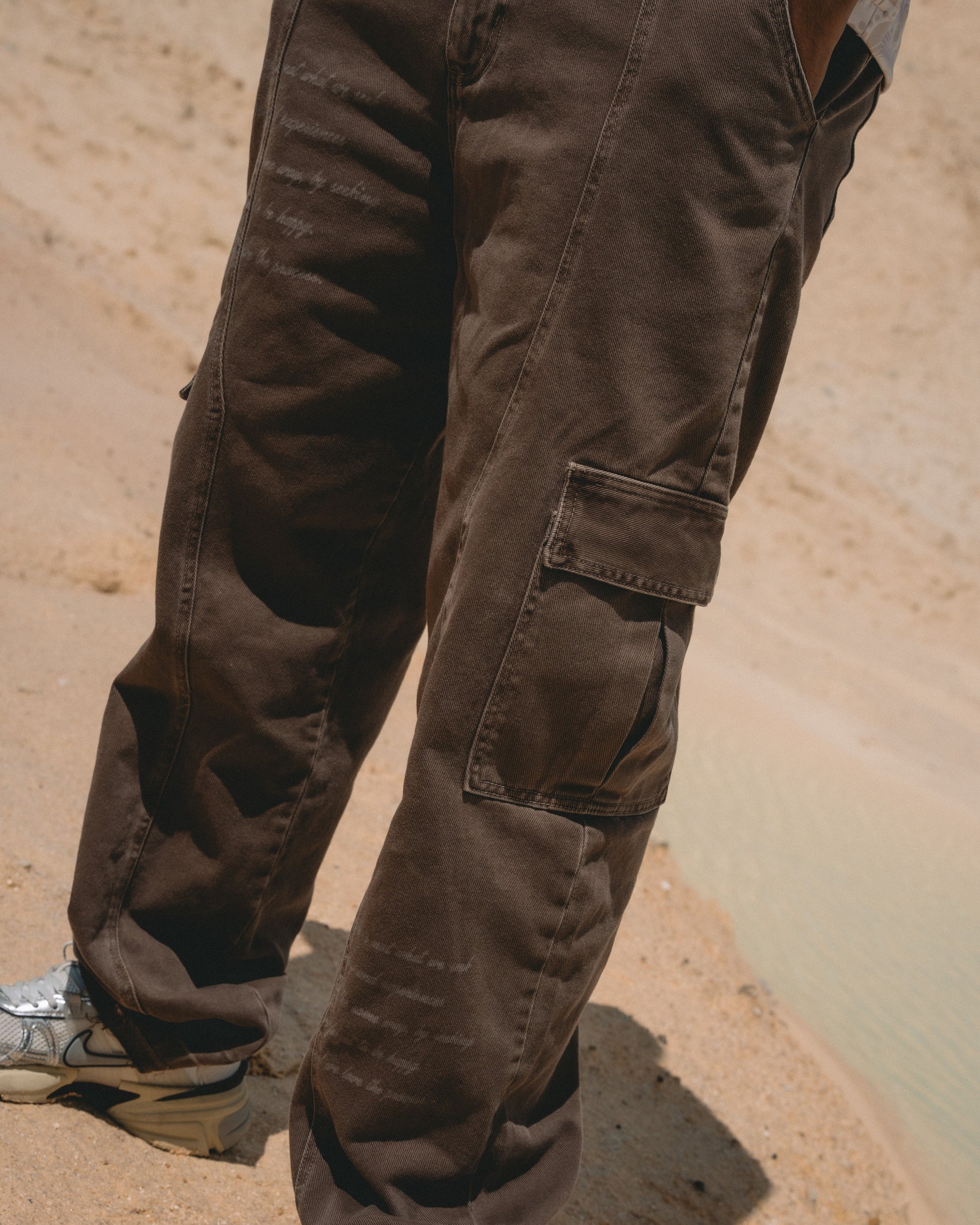 Pantalón cargo café Treasure con diseño baggie y bota ancha que combina estilo urbano con comodidad. Fabricado en denim premium con teñido desgastado tipo Acid Wash que le da un acabado vintage auténtico. Cuenta con bolsillos laterales cargo funcionales, frases frontales grabadas en láser y una garra en cuero sintético personalizada CVD.